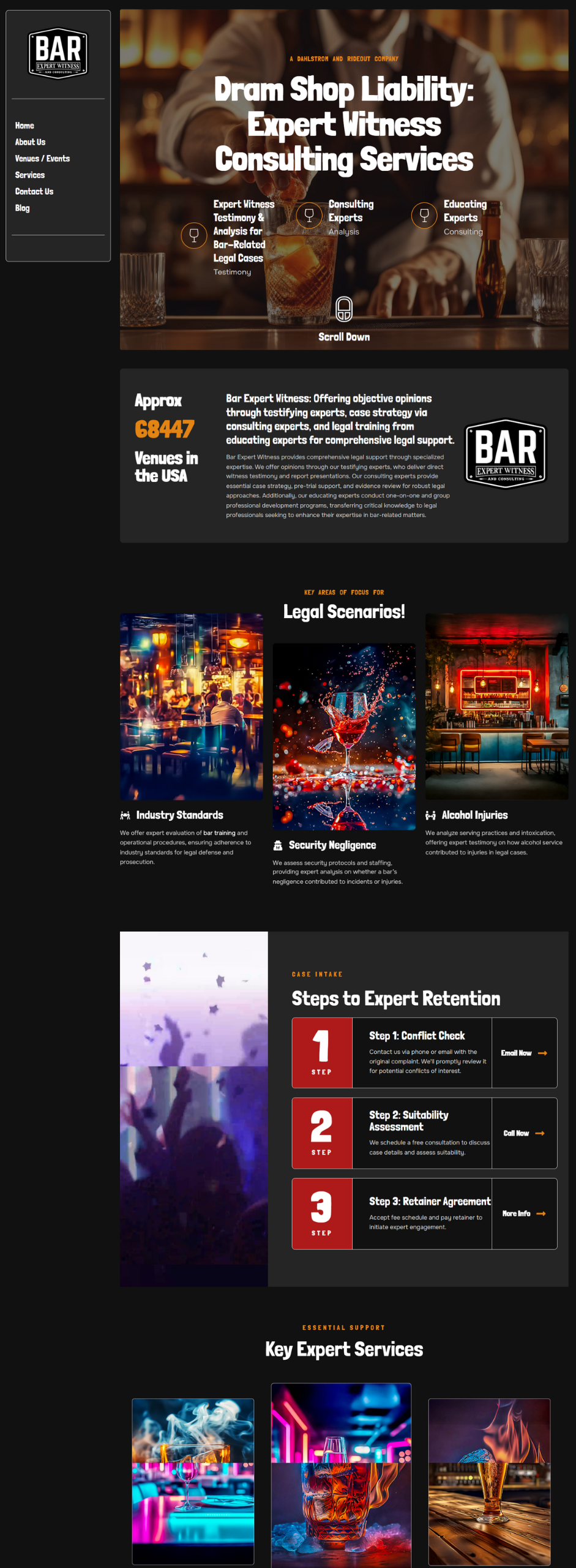 Expert Witness Marketing was engaged to develop a refined and authoritative website that reflects the firm’s depth of expertise and multi-dimensional services. The result is a semi-custom design with a polished hero section introducing “Testifying Experts,” “Consulting Experts,” and “Educating Experts”—each supported by intuitive navigation through Home, About Us, Venues/Events, Services, Blog, and Contact. Key service areas—including Dram Shop Liability, Industry Standards, Security Negligence, and Alcohol Injuries—are presented with clarity and linked to actionable case intake prompts like “Submit Request Now.” The design emphasizes user conversion through streamlined forms, clean layout, strong typography, and mobile responsiveness. SEO optimization focuses on core terms such as “bar expert witness,” “dram shop analysis,” and “security negligence testimony” to enhance discoverability. By combining strategic design with precise content and lead-generation tools, Expert Witness Marketing has built a site that positions Bar Expert Witness as a trusted, multi-faceted resource for litigation support in bar-related expert matters.