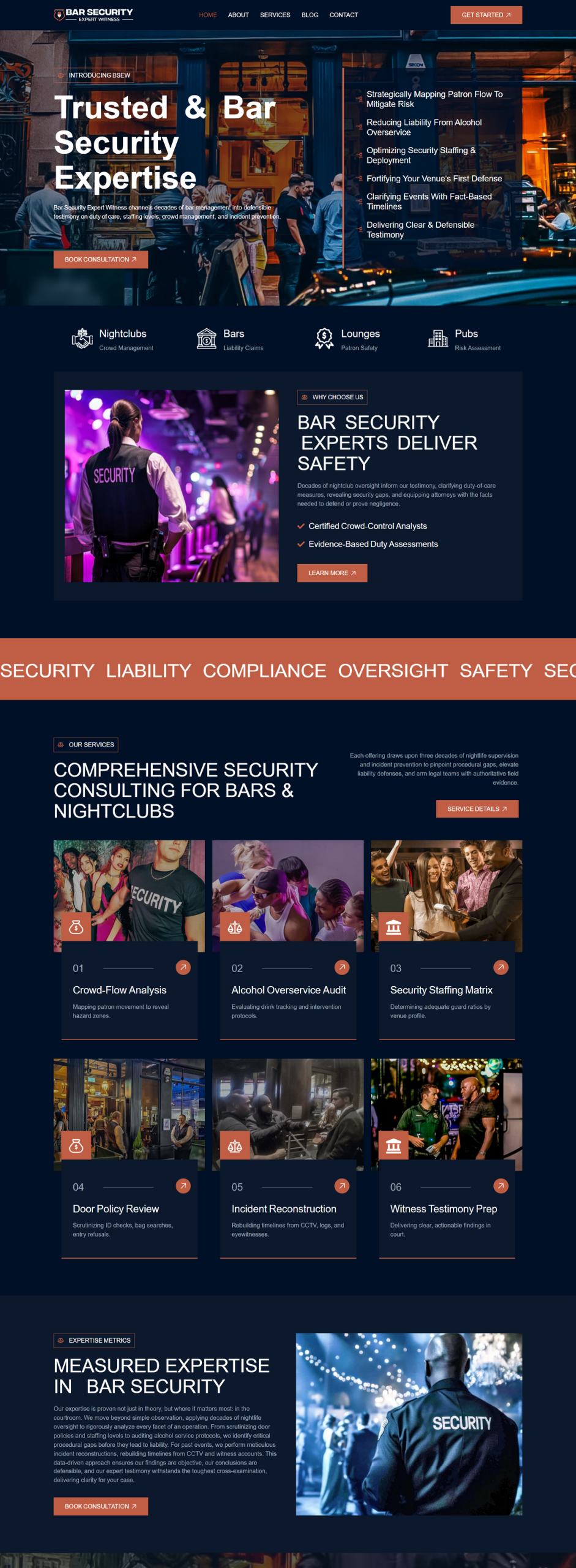 Expert Witness Marketing partnered with Bar Security Expert Witness to craft a specialized website that underscores their niche expertise and drives legal engagement. The site features a semi-custom layout with clear navigation—Home, About, Services, Blog, Contact—and prominent CTAs like “Book Consultation.” The homepage introduces the firm with bold messaging such as “Trusted & Bar Security Expertise,” and highlights core capabilities like Crowd-Flow Analysis, Alcohol Overservice Audits, Security Staffing Matrix, Door Policy Review, Incident Reconstruction, and Witness Testimony Prep. Designed for performance, the site is mobile-responsive, optimized for search queries including “bar security expert witness” and “crowd control liability,” and built to efficiently convert visitors through “Learn More” and “Service Details” links. Credibility is reinforced through messaging that ties decades of operational oversight to forensic testimony readiness. With its tightly structured content and functional design, Expert Witness Marketing has positioned Bar Security Expert Witness as a decisive authority for legal queries relating to bar safety, liability, and incident prevention.