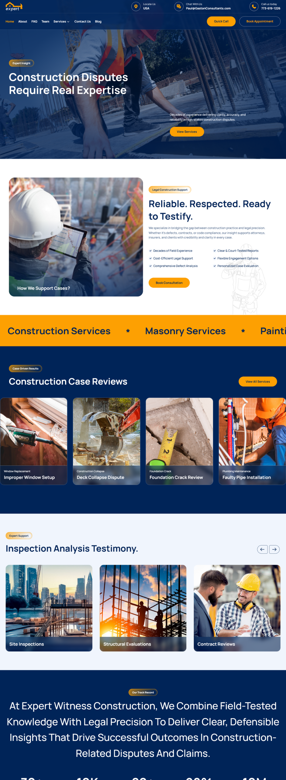 Expert Witness Marketing partnered with Expert Witness Construction to create a polished and authoritative website that reflects both technical depth and legal reliability. The semi-custom design features intuitive navigation (Home, About, Services, Team, FAQ, Blog, Contact), bold headlines (e.g., “Reliable. Respected. Ready to Testify.”), and user-focused calls to action such as “Book Consultation” and “Request Report.” Service pages clearly outline core offerings—Construction Defects, Code Compliance, Structural Evaluation, Safety Audits, Materials Failure Analysis, and Delay Claim Assessment—paired with expert visuals and concise descriptions. The “Team” section highlights the credibility of professionals like Paul Gaston and Christian Sprenkle, and the “About” page emphasizes over 30 years of forensic construction experience and national engagement. SEO was tailored to key phrases like “construction expert witness” and “defect analysis testimony,” and the site is fully responsive, fast-loading, and designed for optimal user conversion with streamlined contact forms and easy appointment scheduling. Through thoughtful design and targeted messaging, Expert Witness Marketing delivered a site that positions Expert Witness Construction as a trusted, high-impact resource for legal professionals handling construction litigation.