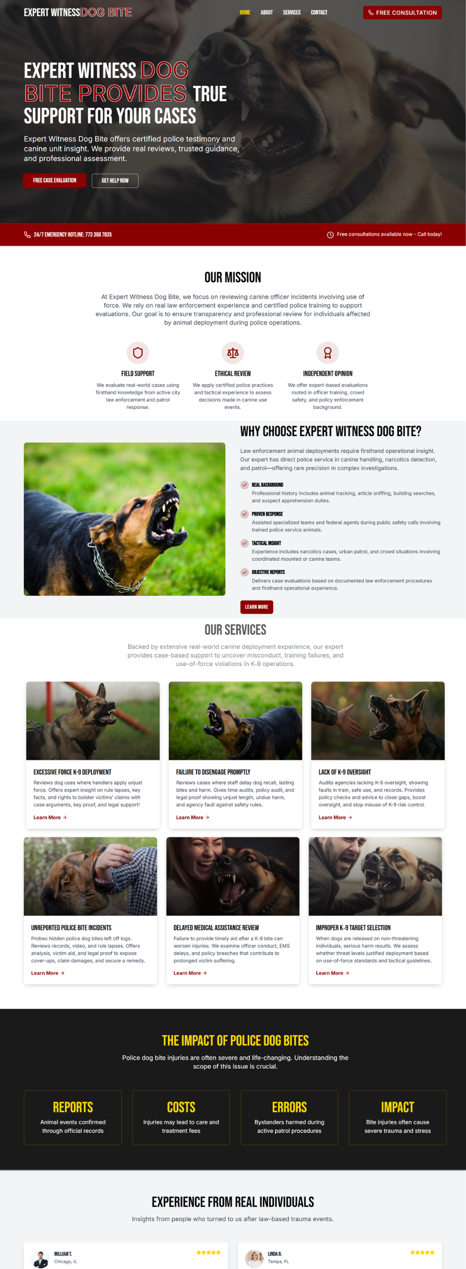 Expert Witness Marketing collaborated with Expert Witness Dog Bite to craft a high-impact website that communicates authority, professionalism, and accessibility. The semi-custom design features intuitive navigation—Home, About, Services, Contact—paired with prominent CTAs like “Free Consultation” and “Get Help Now” for direct client engagement. The “Services” section delivers clear breakdowns of specialized offerings, including Excessive Force K-9 Deployment Review, Delayed Disengagement Analysis, K-9 Oversight Audits, Unreported Bite Incident Investigations, and Medical Response Delay Evaluation. Each service connects real-world police training and tactical practices with legal evaluation tools. The site also includes a 24/7 emergency hotline and quick-access contact form to streamline assistance.