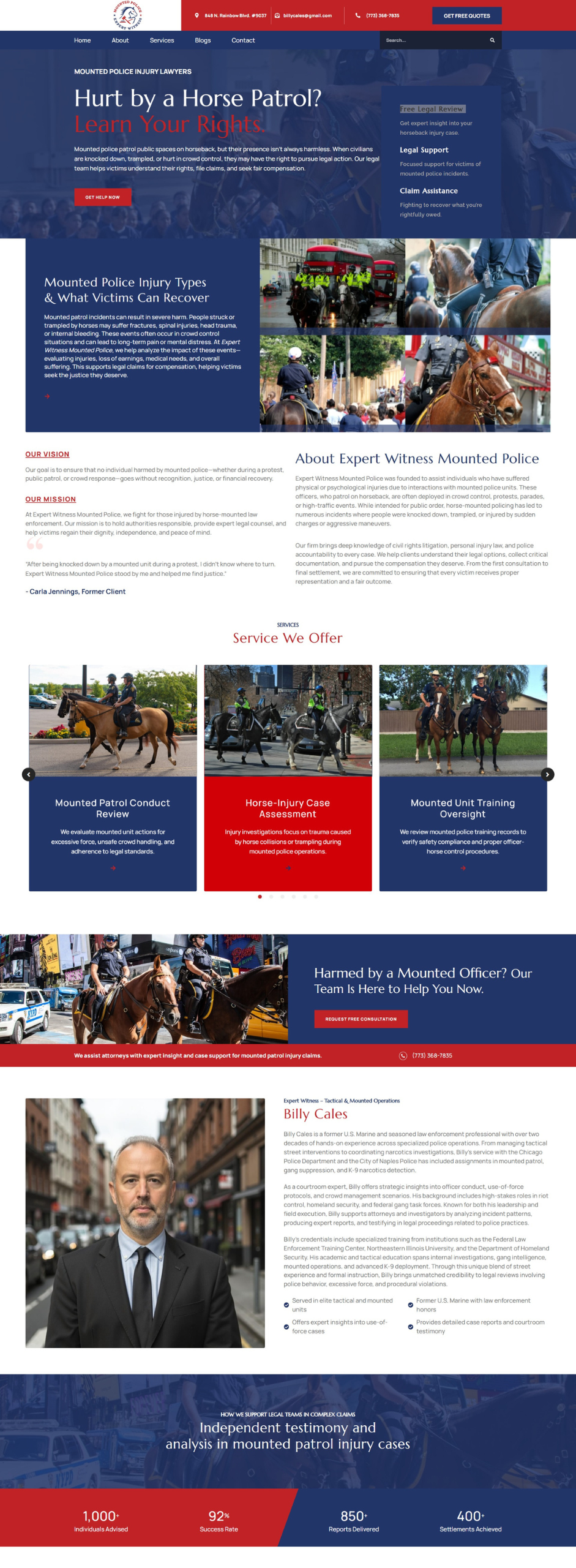 The design allows legal professionals to quickly understand services, review case types, and initiate consultation. Behind the visuals sits thoughtful UX: mobile-responsive layout, fast loading, and SEO optimized for terms like “mounted police expert witness” and “horse patrol injury litigation.” Credibility is reinforced with team bios, statistics on cases advised, and client testimonials such as “Their reports clarified facts and strengthened our legal arguments.” Conversion tools include intuitive forms, phone click-to-call links, and understanding-first messaging. Through this redesign, Expert Witness Marketing has delivered a responsive, authoritative platform that positions the firm as a compassionate, high-caliber resource for professionals handling injuries involving mounted law enforcement.