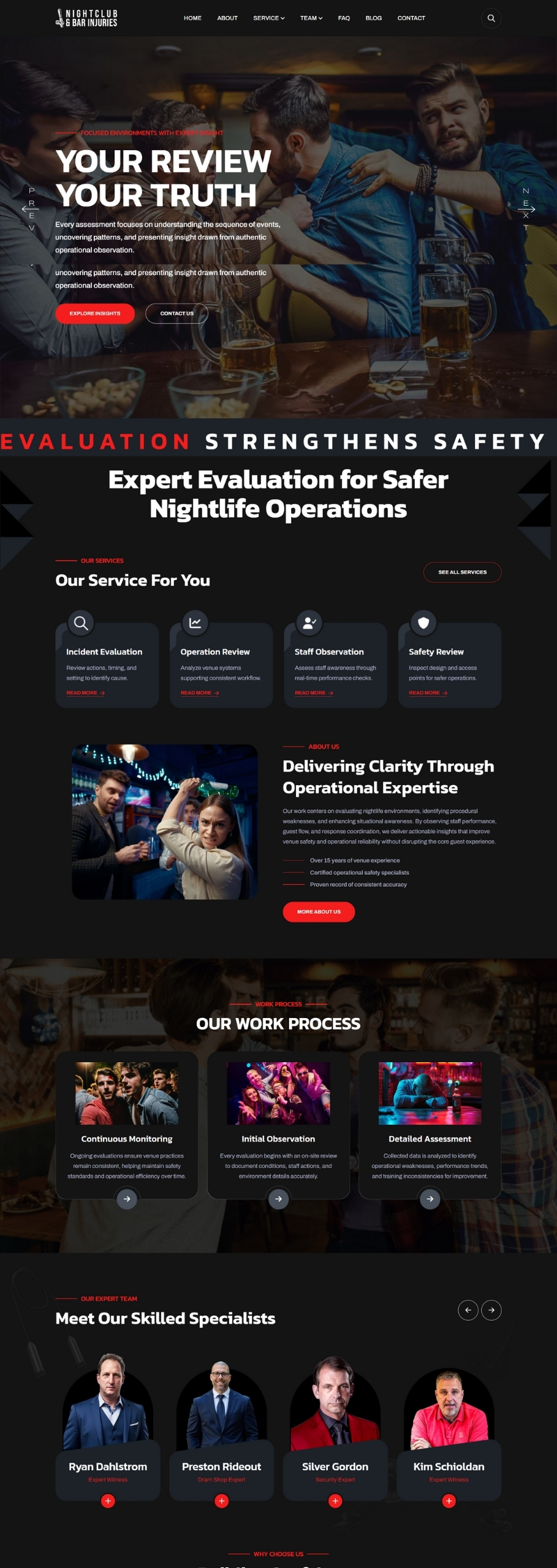 The site design is clean, mobile-responsive, and optimized for performance. Key attorney-facing terminology such as “nightclub injury expert,” “bar security assessment,” and “liquor liability review” is integrated into content and page titles to support search visibility. A dedicated team section highlights each expert’s credentials, while the About page reinforces the firm’s experience in high-risk hospitality environments. Testimonials from legal clients add credibility and reinforce trust. With its strategic structure, targeted language, and conversion-focused layout, the website positions Nightclub and Bar Injuries Expert Witness as a leading authority for attorneys seeking insight into alcohol-service and nightlife injury claims.